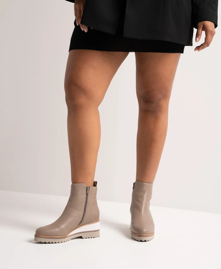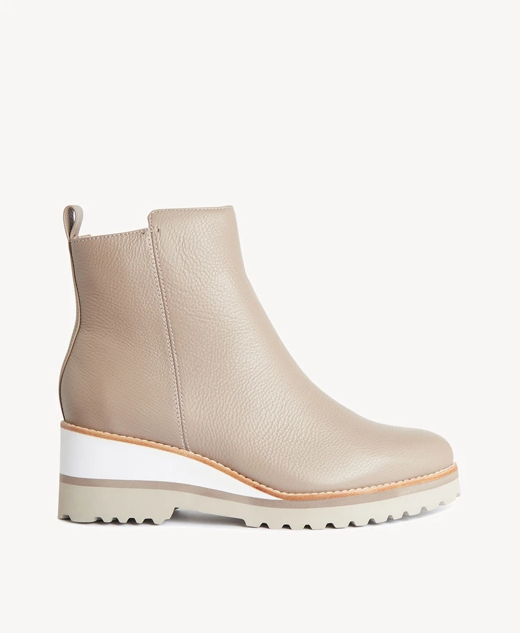 Featuring a mid-height wedge and inside zip, the Bank boot provides that extra height without the pitch of a heel. The Bank boot is modern yet wearable, with the cleansided upper making a sleek updated statement.