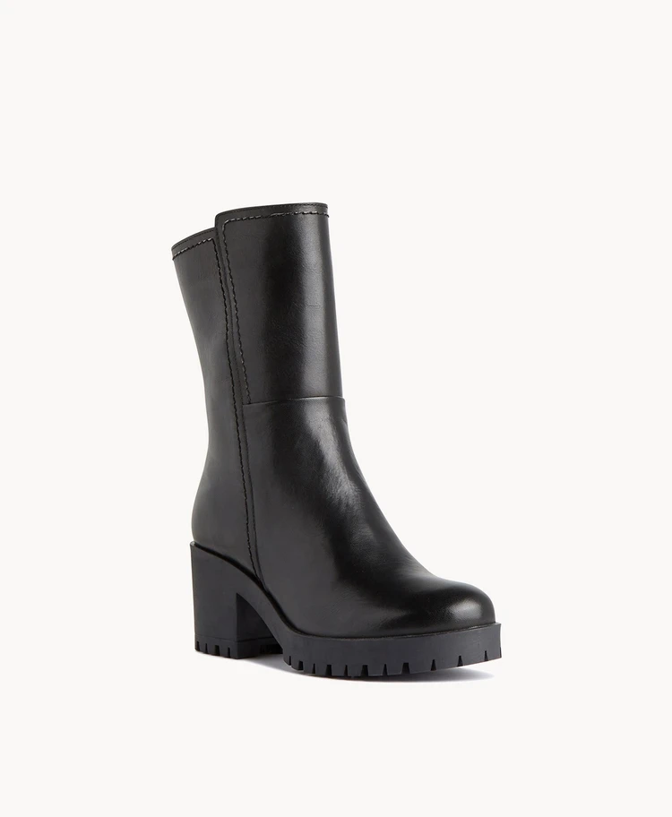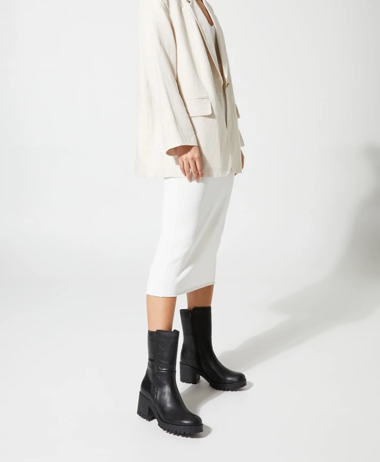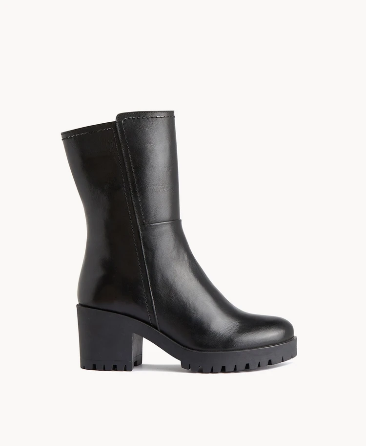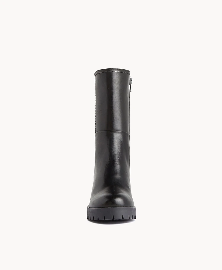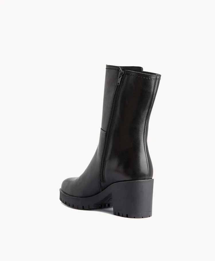 Our Cara boot draws on biker styling, with a 7cm block heel set on a chunky tread sole. Crafted in Portugal in premium leather, give any outfit an edge in Cara.