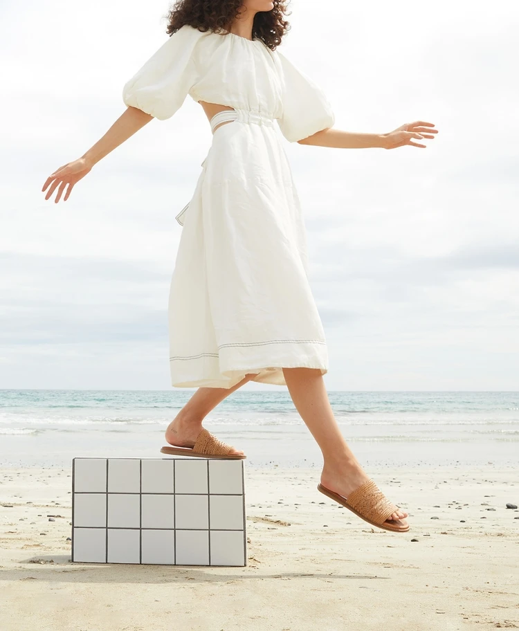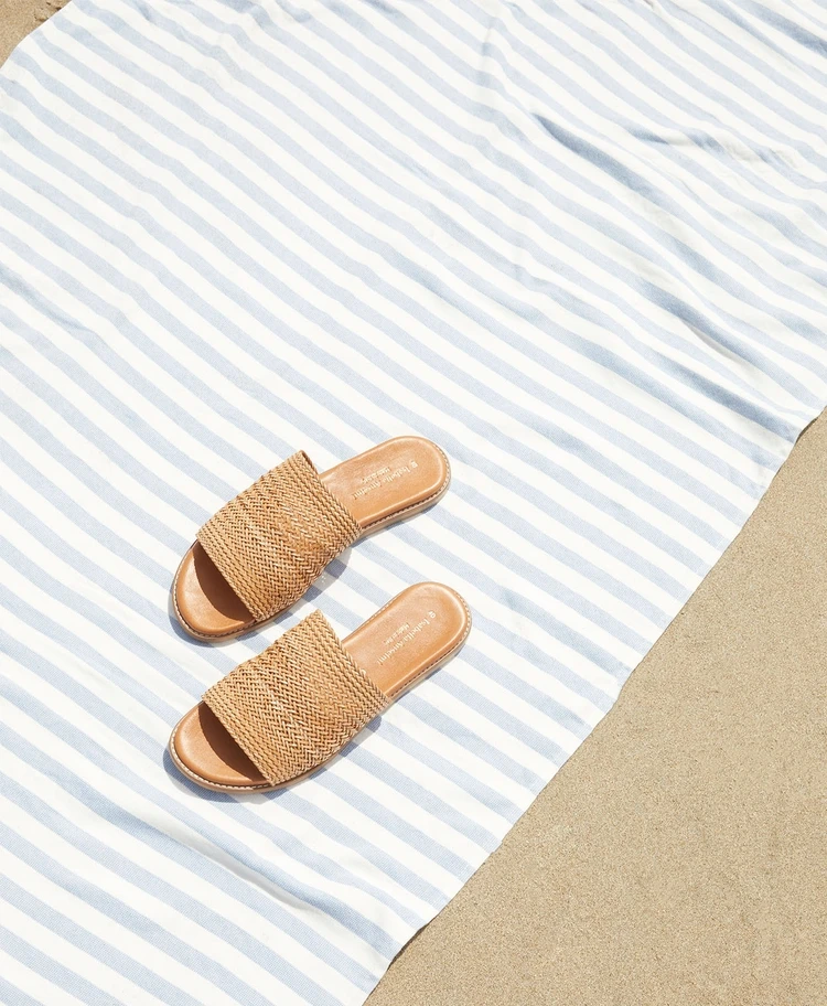 Crafted in Italy, these slide sandals are both rustic and chic, with a raffia upper, comfortable leather footbed and a rubber sole.