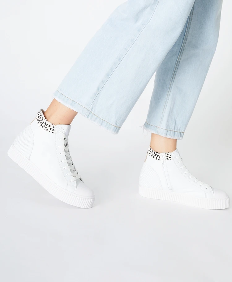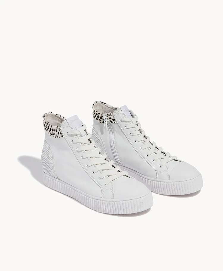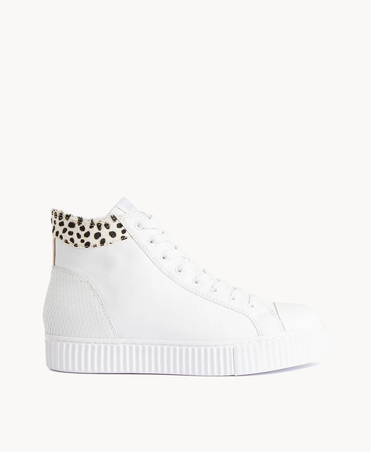 Our Dixon Hightop Deuce sneaker has a material interest heel and molded outsole that references vintage athletic styles. The faux leopard trim really dresses up this off duty style.