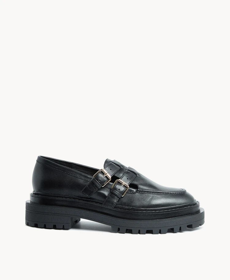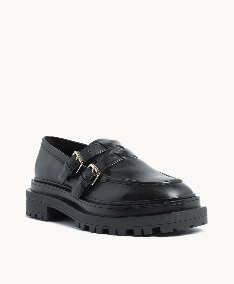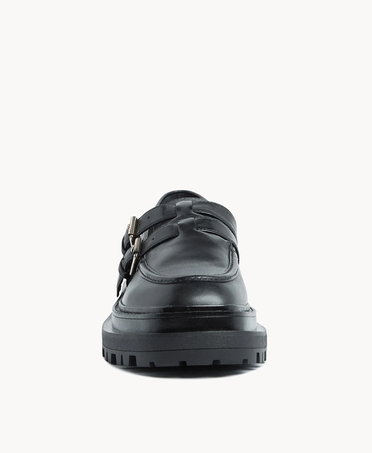 These of-the-moment loafers feature a double buckle detail, rubber tread sole and super modern square toe. Try these with short tailored pieces for a bold look.