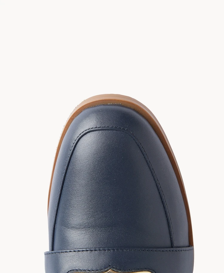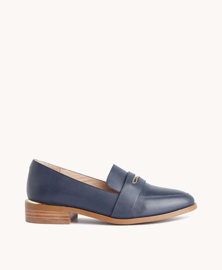 Our Theo loafer feels dressy and understated – perfect for tailored workwear or smart weekend looks. The leather stacked heel adds a subtle lift and has a metallic plate insert that we love.