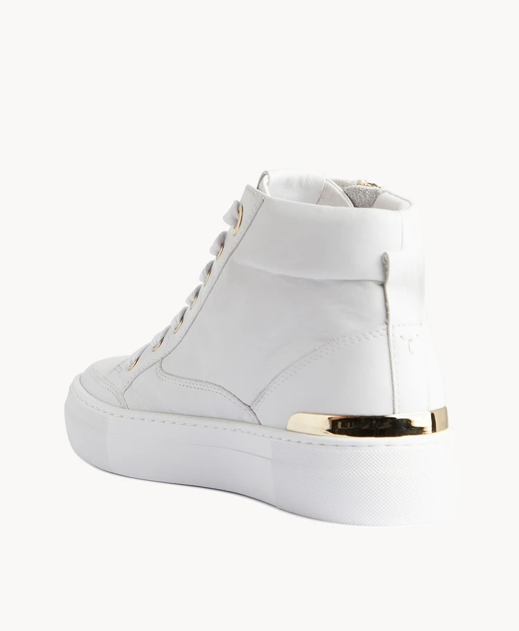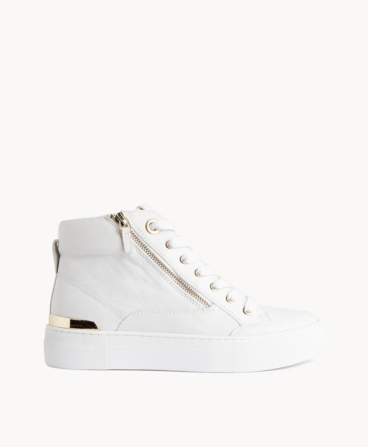 Our Vivian hightop sneaker references 70’s athletic designs, updated with a functional side zipper in a luxe metallic tone. Set on a chunky rubber sole, Vivian has a padded collar and metallic heel plate that matches the eyelets. Show these off with rolled up cuffs.